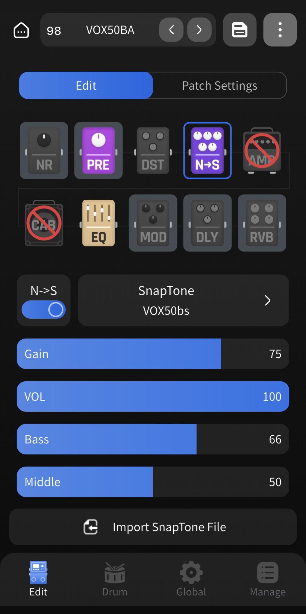 Beim Importieren von NAM Profilen, werden diese in SnapTones umgewandelt. Das bedeutet im Grunde nur, dass die NAM Profile auf ein Niveau heruntergerechnet werden, die der kleine Prozessor des GP-50 auch verarbeiten kann. Dadurch leidet die Qualität etwas, aber im Vergleich mit dem VST-Plugin nur ganz minimal. Live oder im Bandkontext merkt man keinen Unterschied. Im Studio natürlich schon. Bei IRs lassen sich nur 1024er Samples importieren. 2048er werden als „ungültig“ abgelehnt. Leider lassen sich NAM und IR nicht gleichzeitig verwenden. Sobald der NAM-Block aktiviert wird, schalten sich AMP und CAB ab. Man muss sich also gut überlegen, ob man NAM-Captures als Full-Rig oder Amp Only importiert. Wenn man aus sicht des Bassers eine ordentliche Bass-Rig nimmt (z.Bsp. mein 1977er Marshall JCM800 Bass (Super Bass) mit Marshall 4×12 Cabinet) braucht man nur noch einen Compressor und vielleicht etwas EQ, um einen fetten und wirklichen guten Bass-Sound zu bekommen. Das Signal ist rauschfrei.